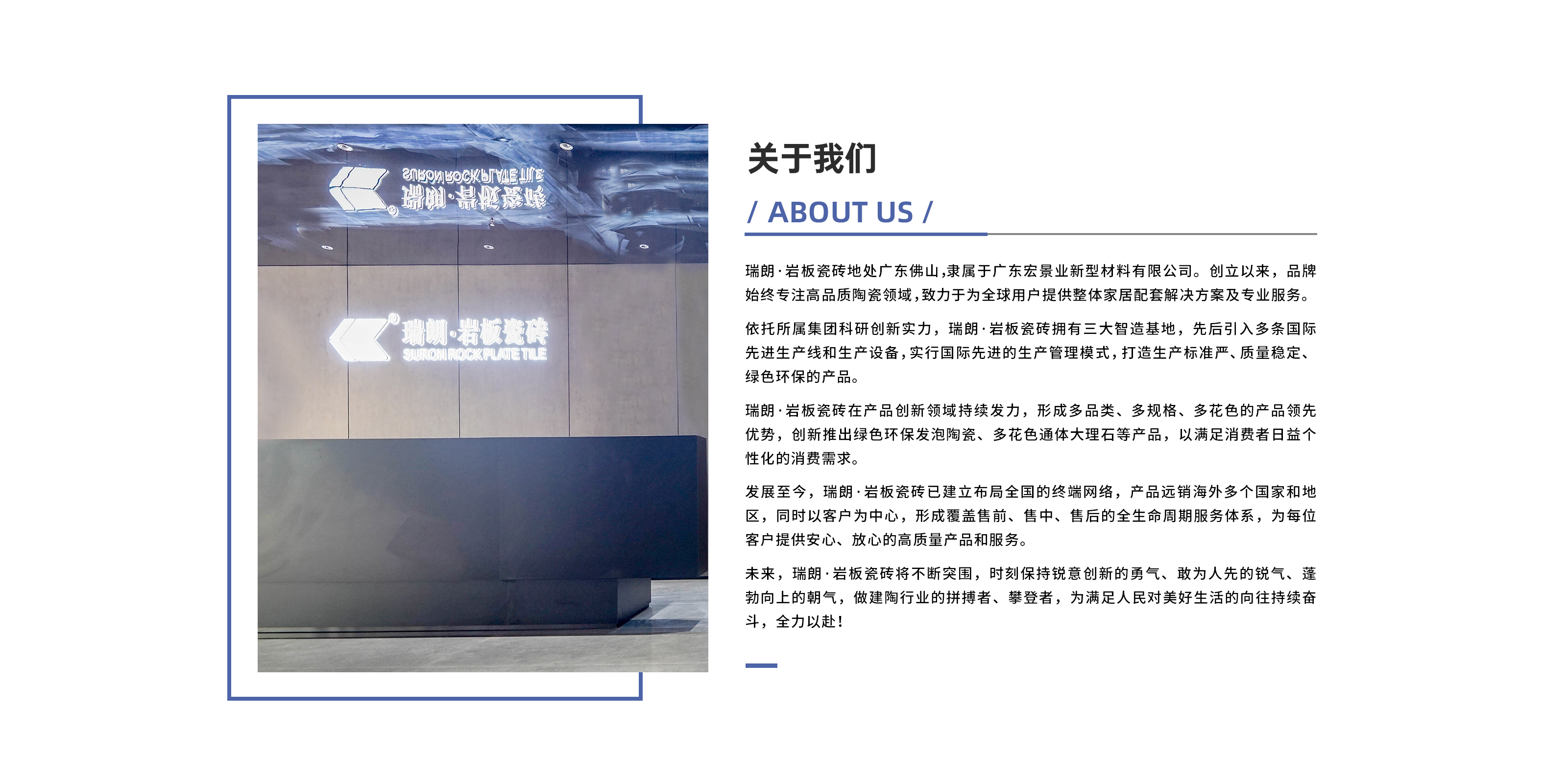 朗·岩板瓷砖地处广东佛山,隶属于广东宏景业新型材料有限公司。创立以来,品牌始终专注高品质陶瓷领域,致力于为全球用户提供整体家居配套解决方案及专业服务。
